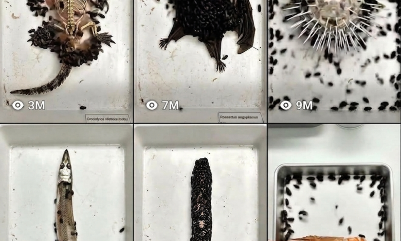 - Image 3 (Mid Decomposition): Large portions of flesh are gone, exposing bones. Beetles are clustered strictly on the remaining flesh. Frass (insect waste) stains the tray.